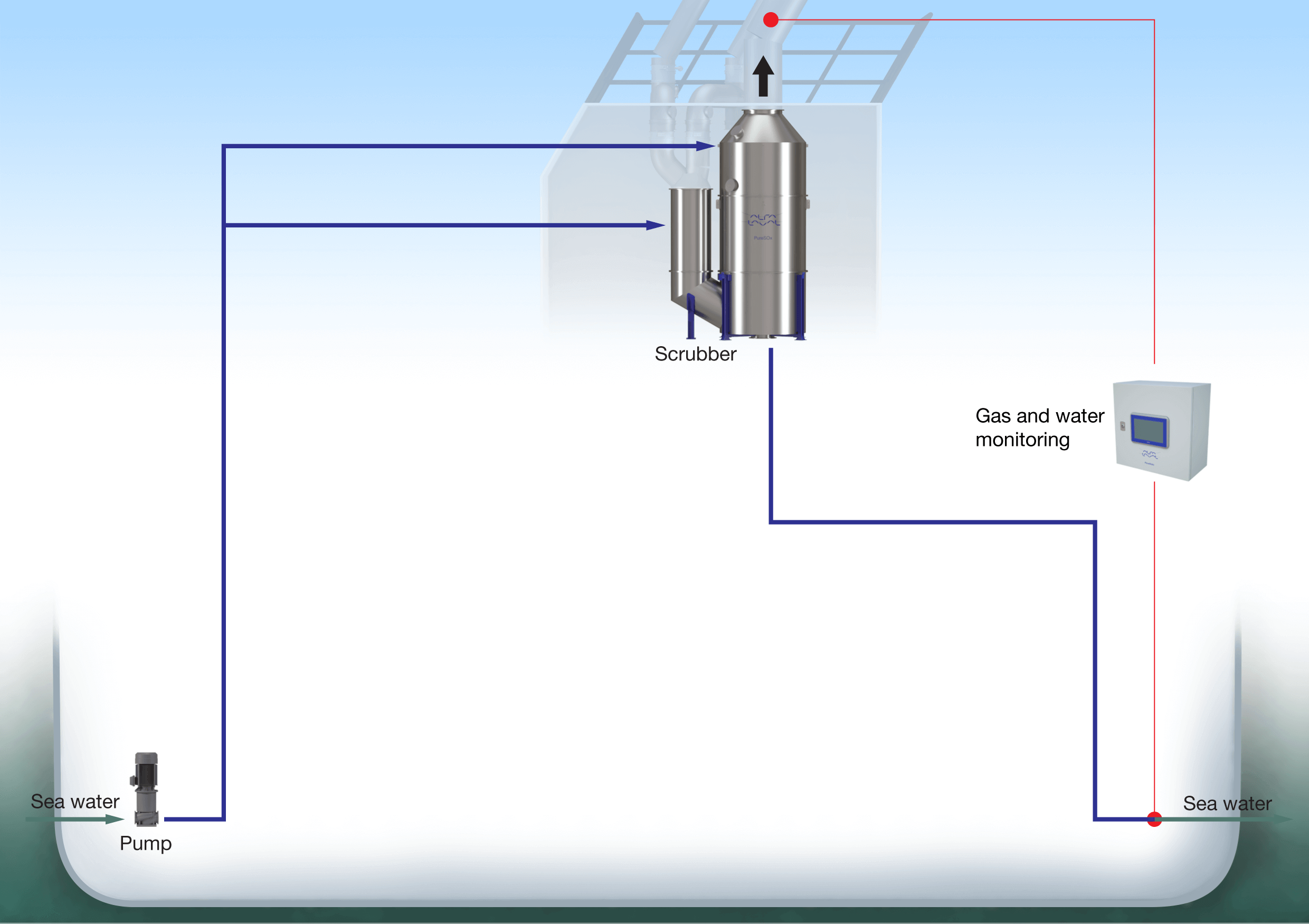 Un depurador de bucle abierto utiliza agua de mar para limpiar el gas de escape. El agua que pasa por PureSOx se vuelve a verter al mar cumpliendo con todas las normas vigentes. Esta configuración es la más económica en cuanto a coste de inversión y de funcionamiento, pero puede verse limitada por las normas locales de vertidos o de baja alcalinidad del agua.